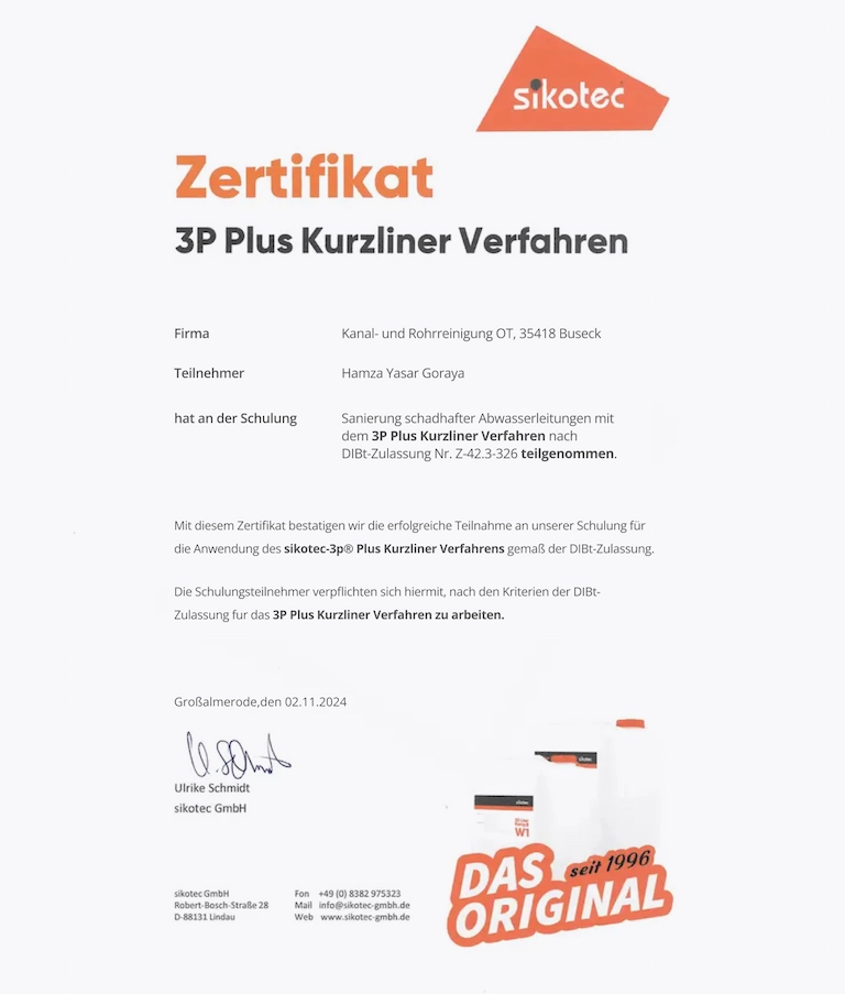 Unser Team ist offiziell geschult und zertifiziert für das 3P-Plus-Kurzliner-Verfahren zur grabenlosen Rohrsanierung. Damit bieten wir dir nicht nur moderne und präzise Technik, sondern auch maximale Sicherheit bei der Instandsetzung beschädigter Abwasserleitungen – sauber, schnell und nach DIBt-zugelassenem Standard.